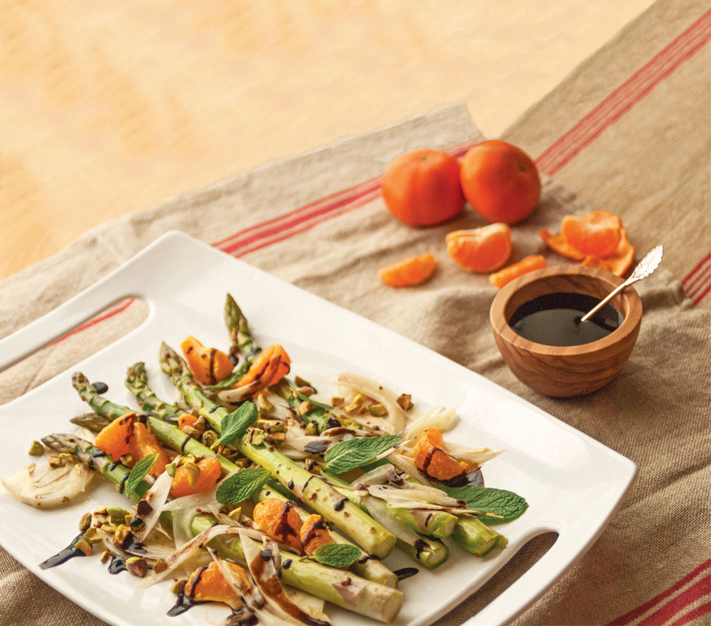 Transfer asparagus and other ingredients to a serving platter and drizzle with tangerine-infused balsamic vinegar. Garnish with fresh mint and pistachio pieces, if desired.