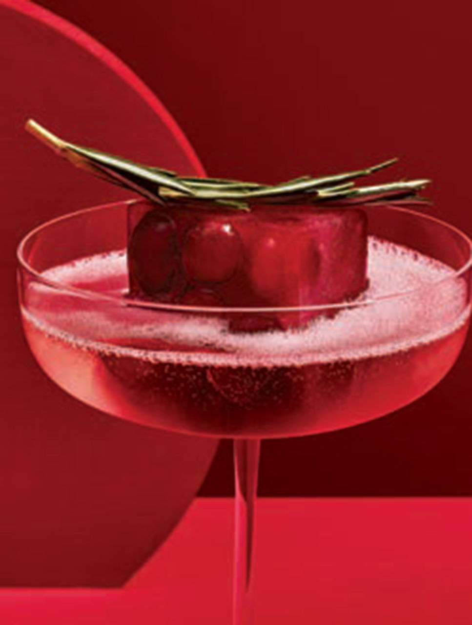 To serve, place one cranberry cube in an 8- to 10-oz coupe. Pour about 4 oz of dealcoholized sparkling wine over cube. Garnish with rosemary and serve immediately. Serves 6