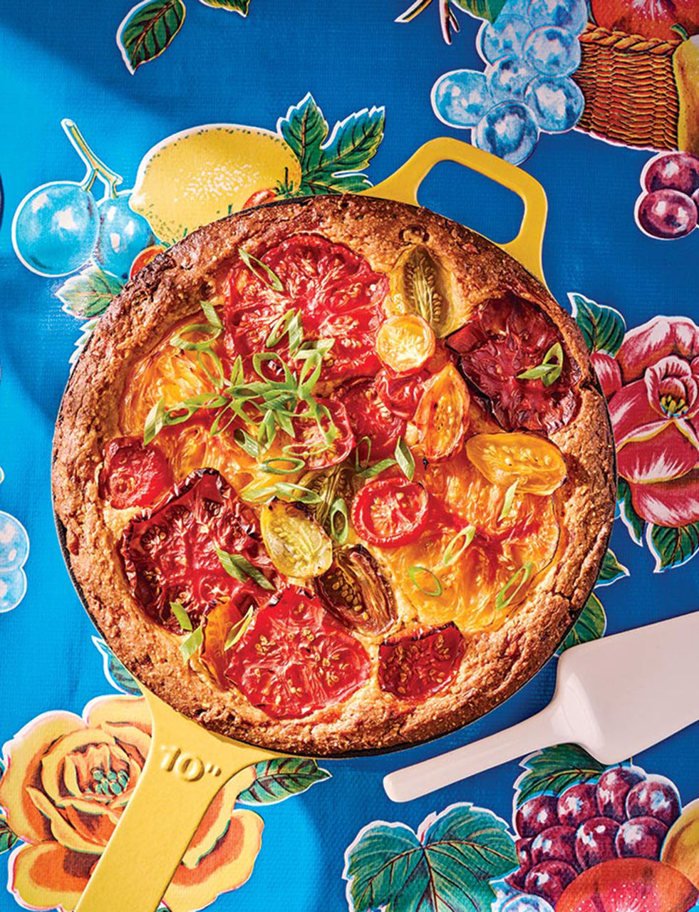 Pour over dry ingredients and stir until just combined. Scrape into prepared skillet and level. Top with overlapping slices of tomato leaving a 1-inch (2.5-cm) border all around.