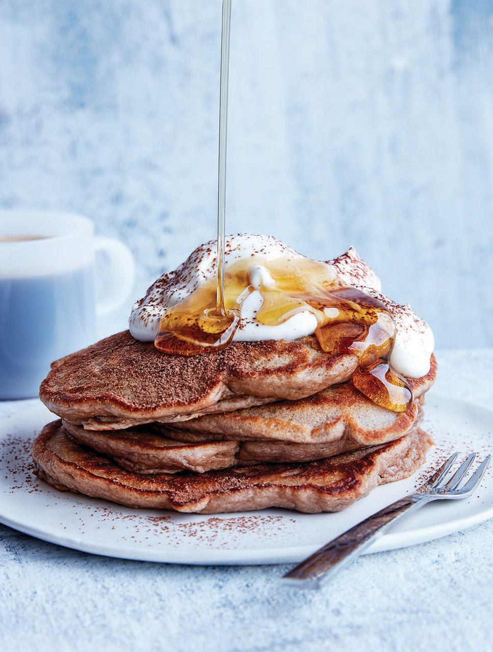 Serve each cooked pancake stack topped with a spoonful of mascarpone topping. Sift cocoa overtop and drizzle with coffee-infused maple syrup.